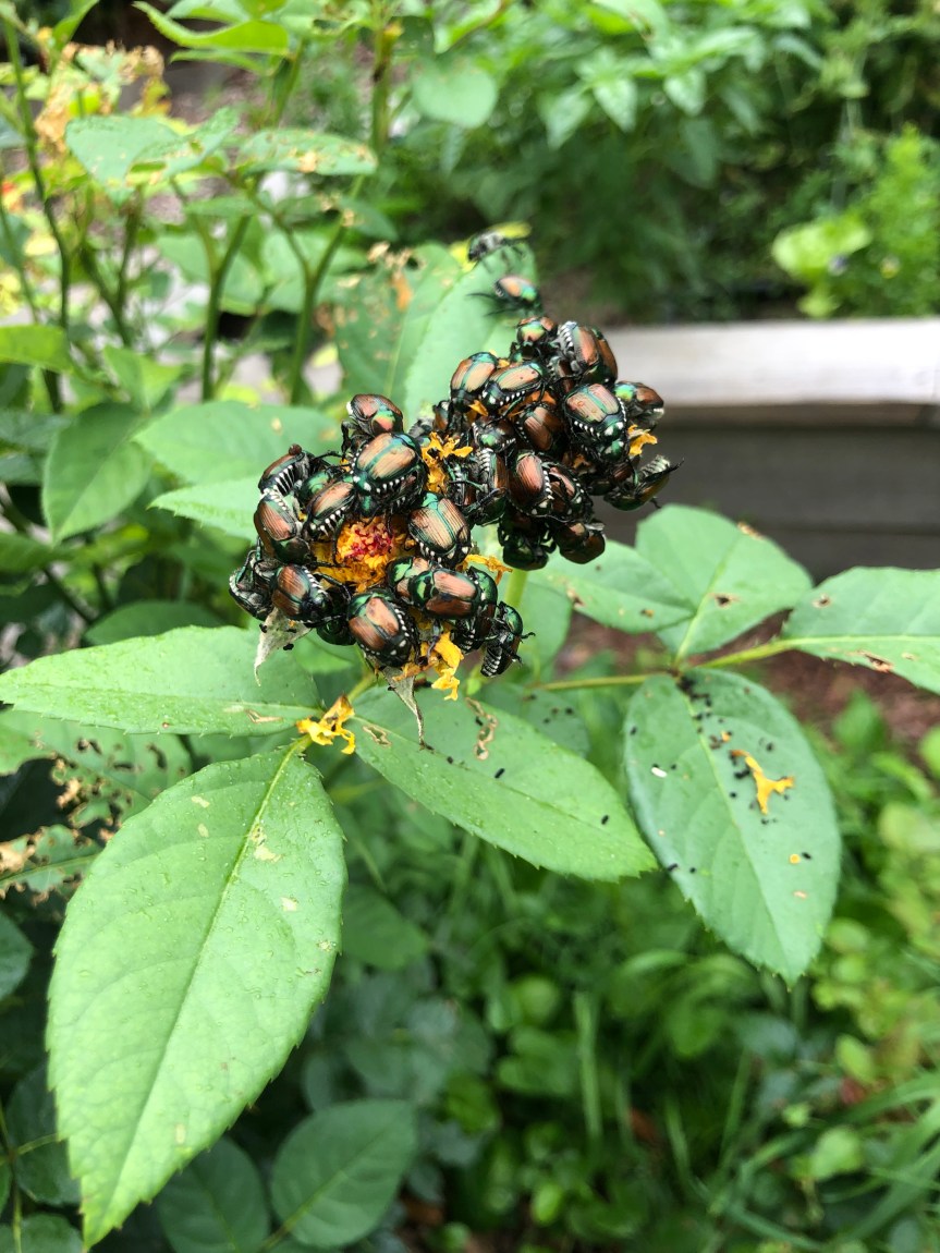 JAPANESE BEETLE DAMAGE: Japanese beetles are gregarious, polyphagous feeders. Polyphagous means eating a lot of different plants. Gregarious means that they are a bit like humans on Thanksgiving. The beetles send out an aggregation pheromone, that “tells the other Japanese beetles that the party is all here.” They gather in masses and feed together and the plant becomes skeletonized, with just the plant’s veins left behind.