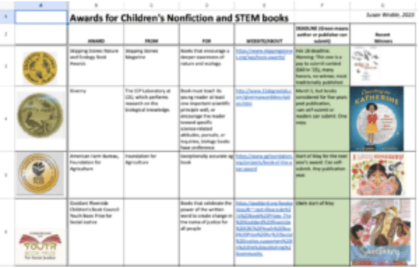 You can access my “Awards for Children’s Nonfiction and STEM” spreadsheet here. The list is focused on awards that authors have some control over, and is organized by submission date. There may still be others out there that I missed. If you find additions or errors, please contact me. And best wishes on your own awards!
