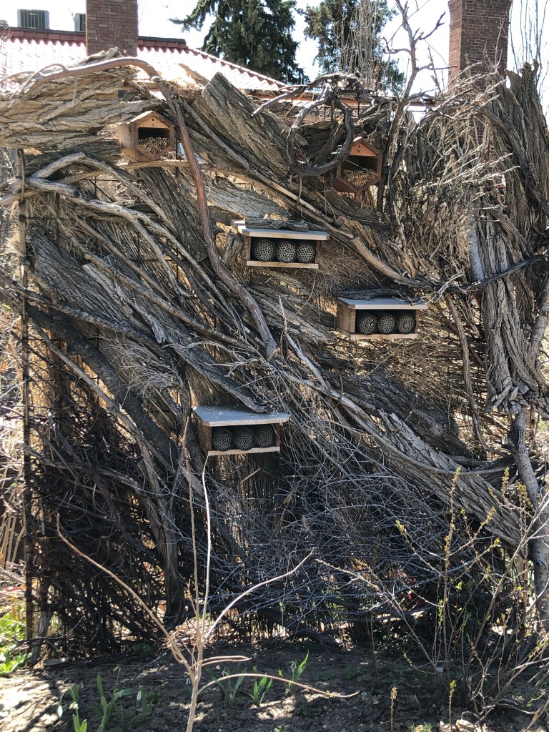 On a recent trip to the Denver Botanic Gardens, my husband and I came across an insect hotel that completely captivated me. I’d seen so many cute little houses, almost like doll houses, with a room of reeds and a room of assorted logs, perhaps some bricks, or pine cones…  But this! This was no neat dollhouse for bugs.