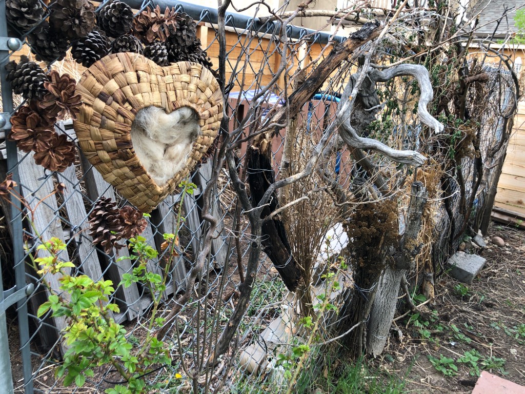 Intricate pieces of bark, collected over the years, soon followed, as did random sticks collected on recent hikes. Some cosmos and sunflowers and yarrow that I had pulled in the fall and layered in my compost bin are now woven in the fence. I even made my husband do a U-turn while driving when I spotted an especially promising branch near the side of the road! I put out a call for dog fur, and tucked it inside a woven basket I had purchased years ago at a thrift store. I love the fact that each time I check on it, a little more has been pulled out by birds to use in nesting.