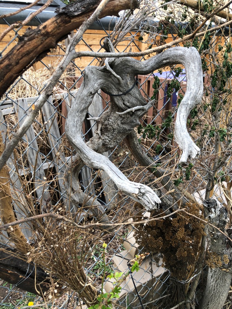 And it turns out that I have been preparing for this particular project for much of my life. I remember, as a young teen, walking in our family’s own 100-acre woods in Virginia and finding what I promptly named the headless horseman. It was the base of an ironwood tree, dead but firmly attached to its roots, and on my next walk in the woods I took along a saw to free the horseman from his rooted home in the banks of Powell’s Creek. That piece has now been with me for a half-century—and was the first that I tied on to the chain link fence to begin my pollinator wall.