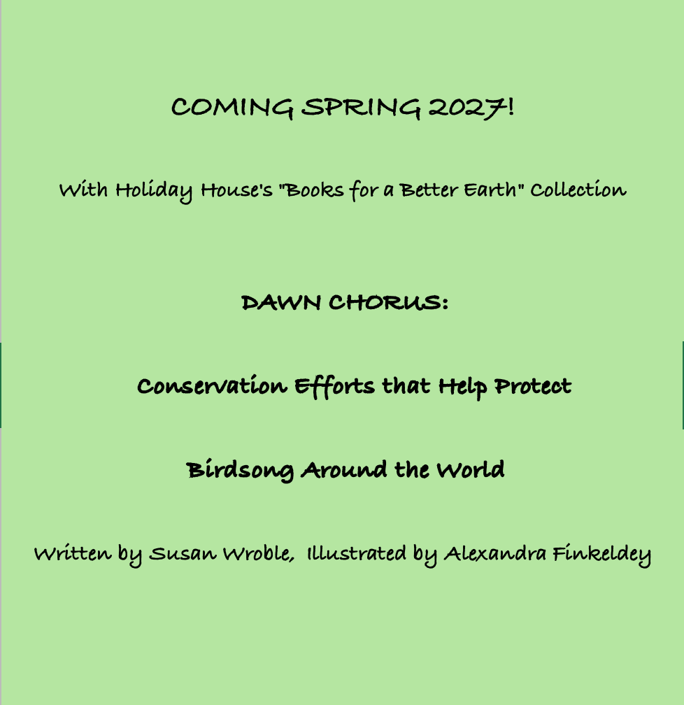 I am thrilled to announce my forthcoming book with Holiday House’s “Books for a Better Earth” collection. DAWN CHORUS: CONSERVATION EFFORTS THAT HELP PROTECT BIRDSONG AROUND THE WORLD will be illustrated by the amazing Alexandra Finkeldey. Alexandra is sought out for her bird illustrations, and I couldn’t be more honored that she is the co-creator for DAWN CHORUS.
